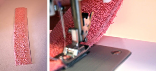Cut two fabric pieces that are four inches by 20 inches. Narrow hem one of the long edges as shown.