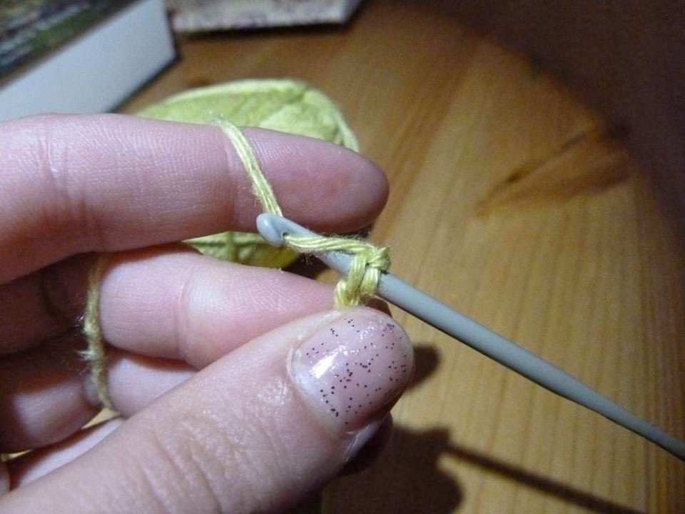 Pulling out a piece of the yarn ... Wrap yarn around the hook to create an O that is only as big as your needle is around - and leave a little tail piece. Tie in a firm knot.